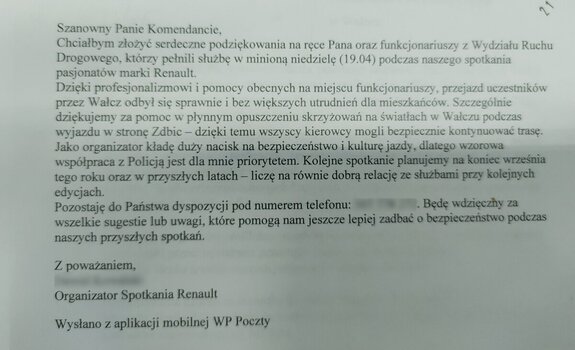 Do Komendy Powiatowej Policji w Wałczu mł. insp. Wojciecha Wnuka wpłynęły oficjalne podziękowania za wzorowe działania funkcjonariuszy podczas zabezpieczenia spotkania miłośników motoryzacji. Organizator wydarzenia docenił zaangażowanie, profesjonalizm oraz dbałość o bezpieczeństwo wszystkich uczestników.