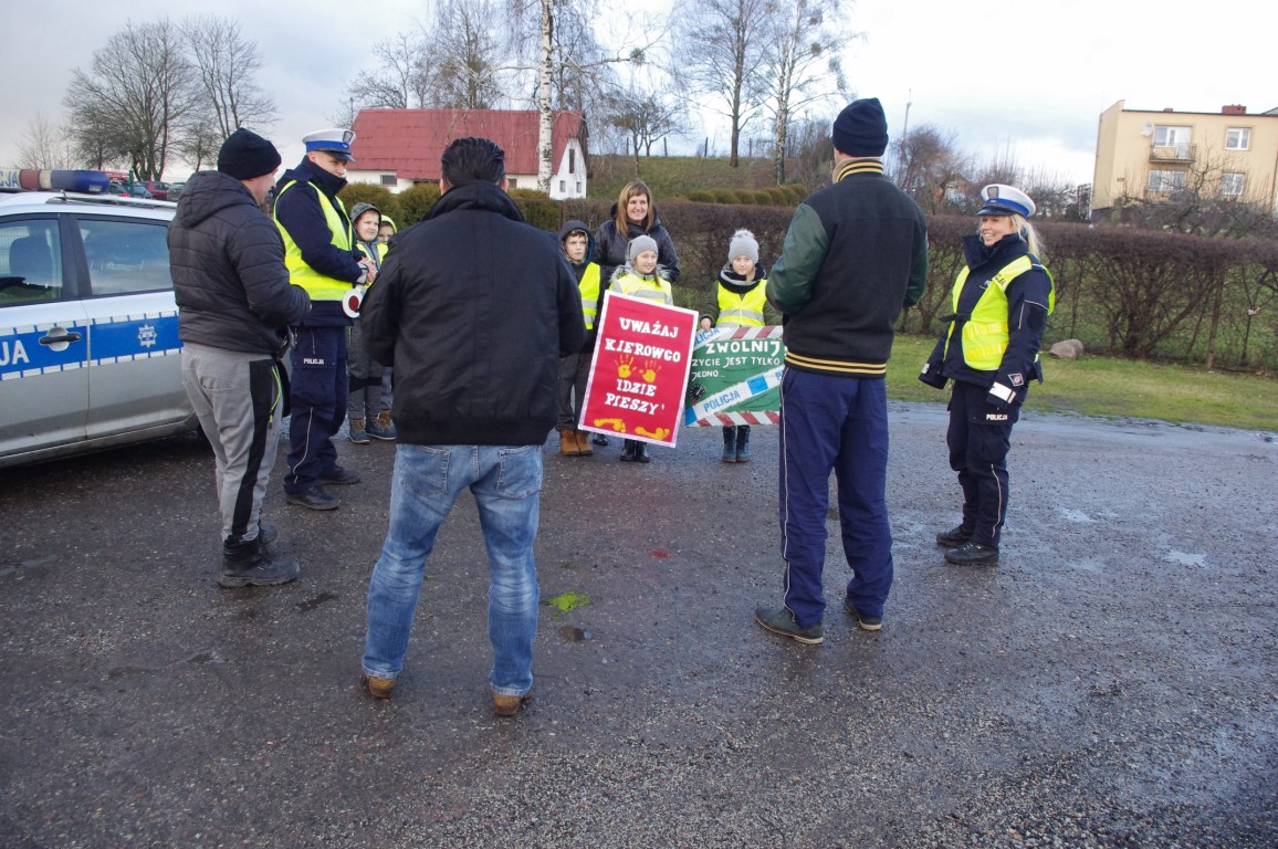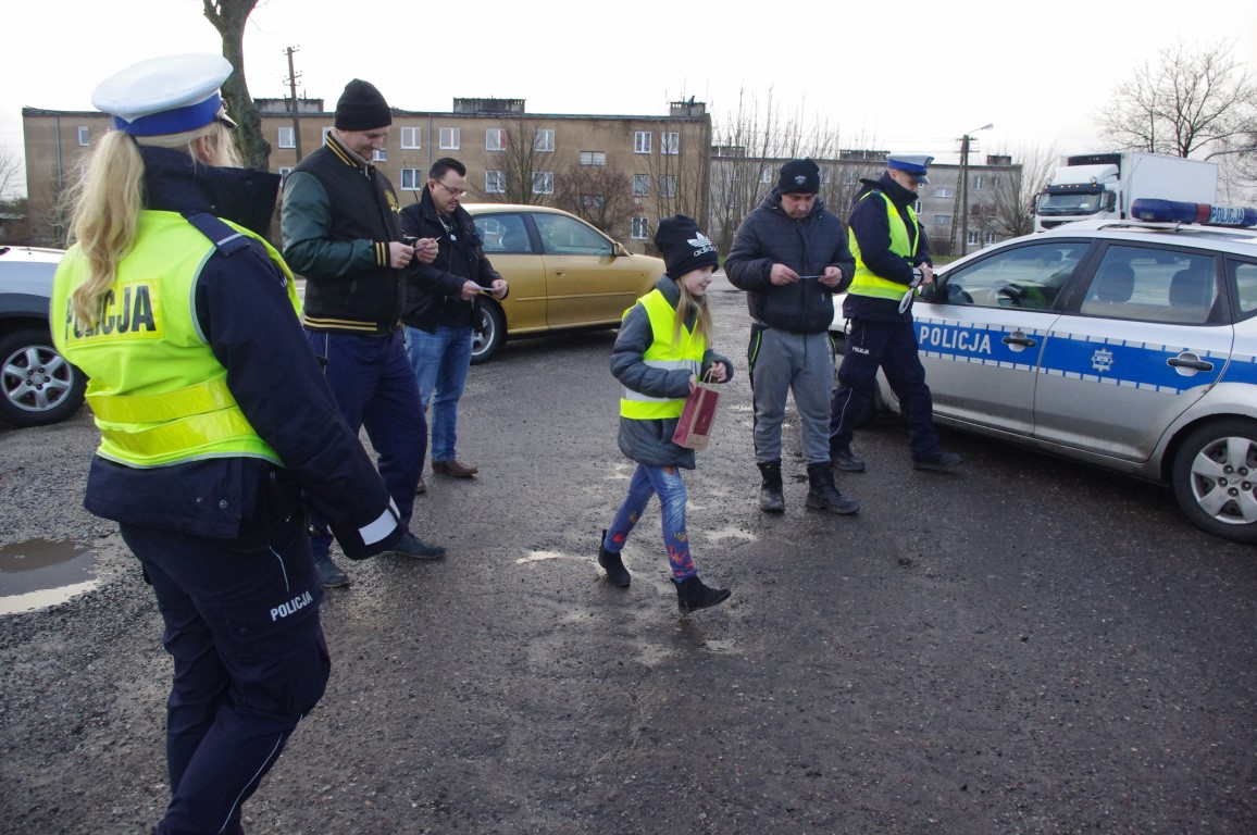 Policjanci w białych czapkach zatrzymywali do kontroli drogowej kierowców, którzy chętnie włączali się do mini testu przygotowanego przez dzieci i nauczyciela. Test „Zgaduj- Zgadula” to zagadki z pytaniami Prawa o Ruchu Drogowym.