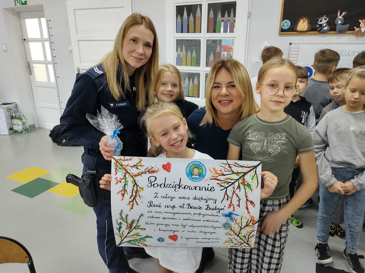 Policjantka dzielnicowa odwiedziła najmłodszych uczniów ze Szkoły Podstawowej w Chwiramie. Spotkanie poświęcone było tematowi bezpieczeństwa oraz roli dzielnicowego w lokalnej społeczności.