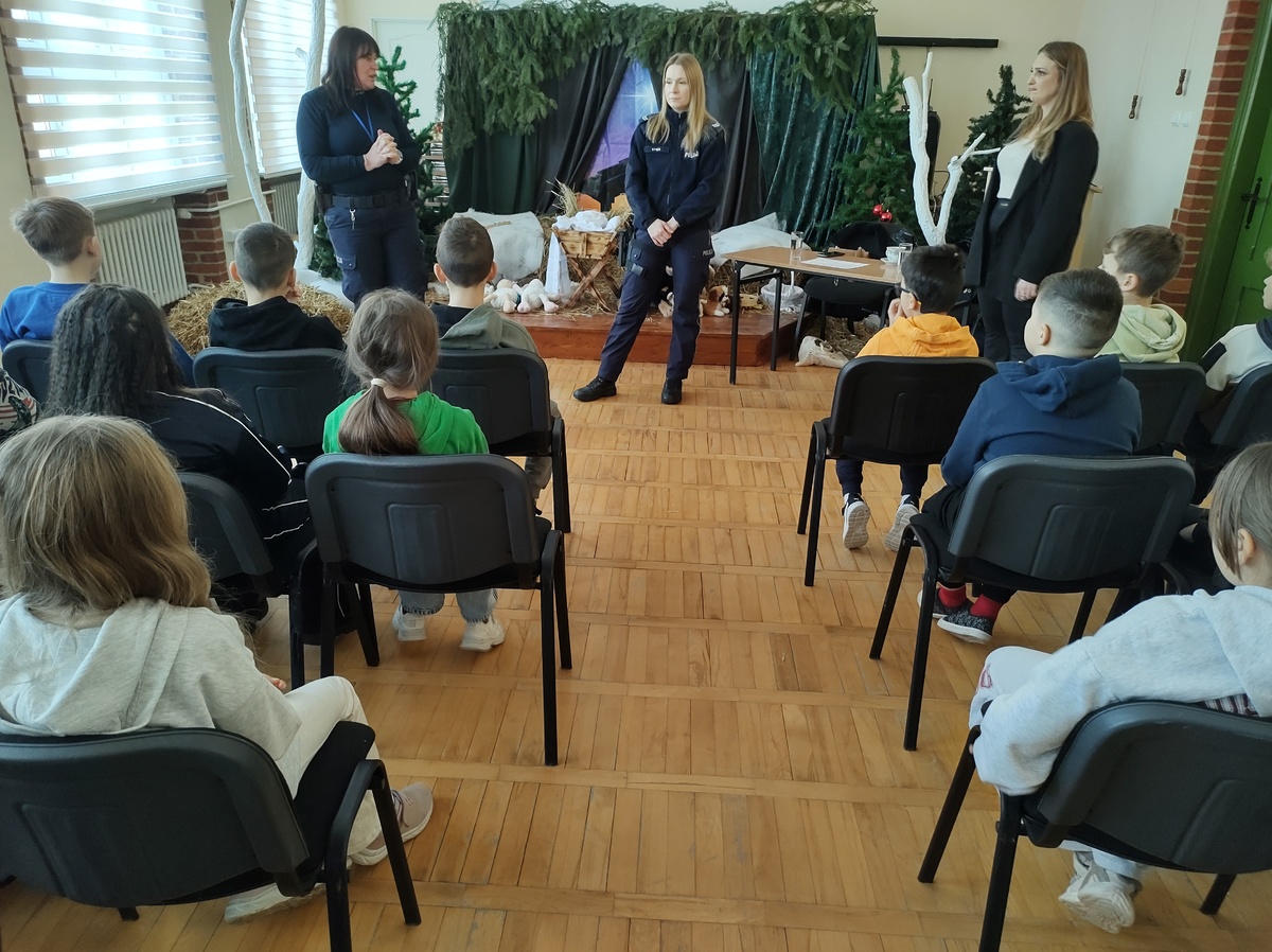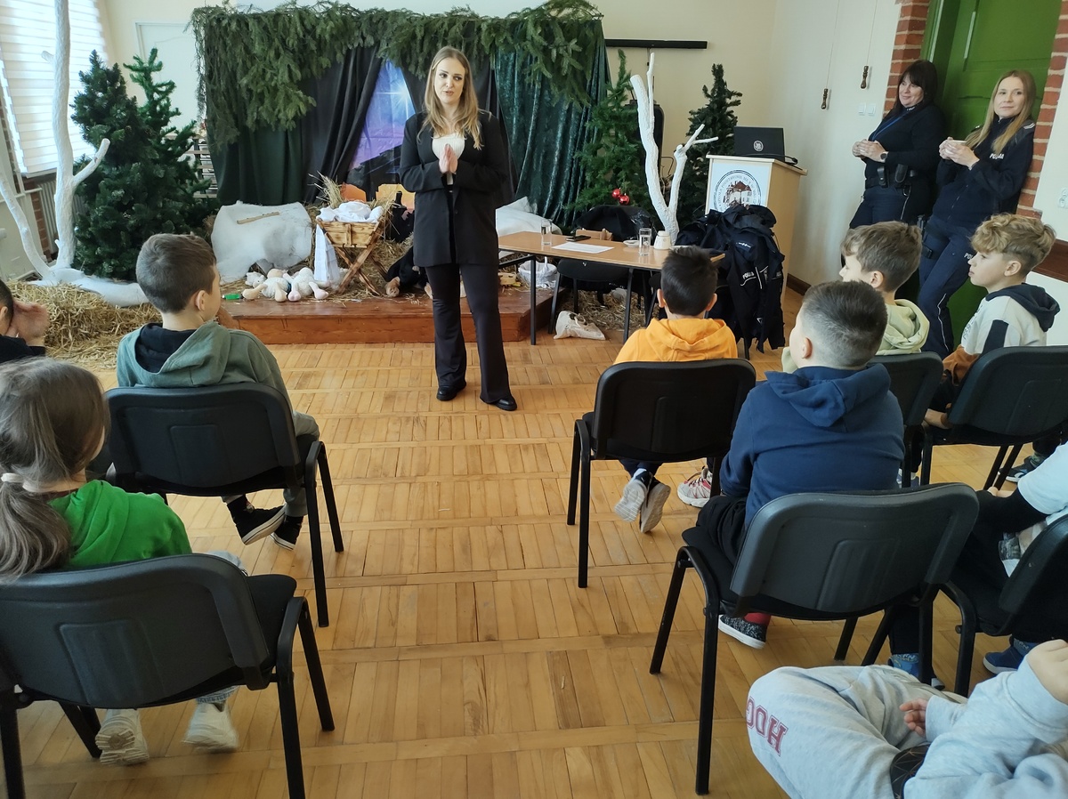 Przedstawiciel sanepidu omówił natomiast kwestie higieny i dbania o zdrowie zimą, zwracając uwagę na profilaktykę chorób, odpowiedni ubiór oraz codzienne nawyki sprzyjające zdrowiu. Spotkania miały charakter edukacyjny i profilaktyczny, a ich celem było zwiększenie świadomości dzieci oraz przygotowanie ich do bezpiecznego spędzania ferii zimowych. Policjantki zachęcały także uczniów do udziału w konkursie organizowanym przez KGP „ Śnieżny dekalog”.