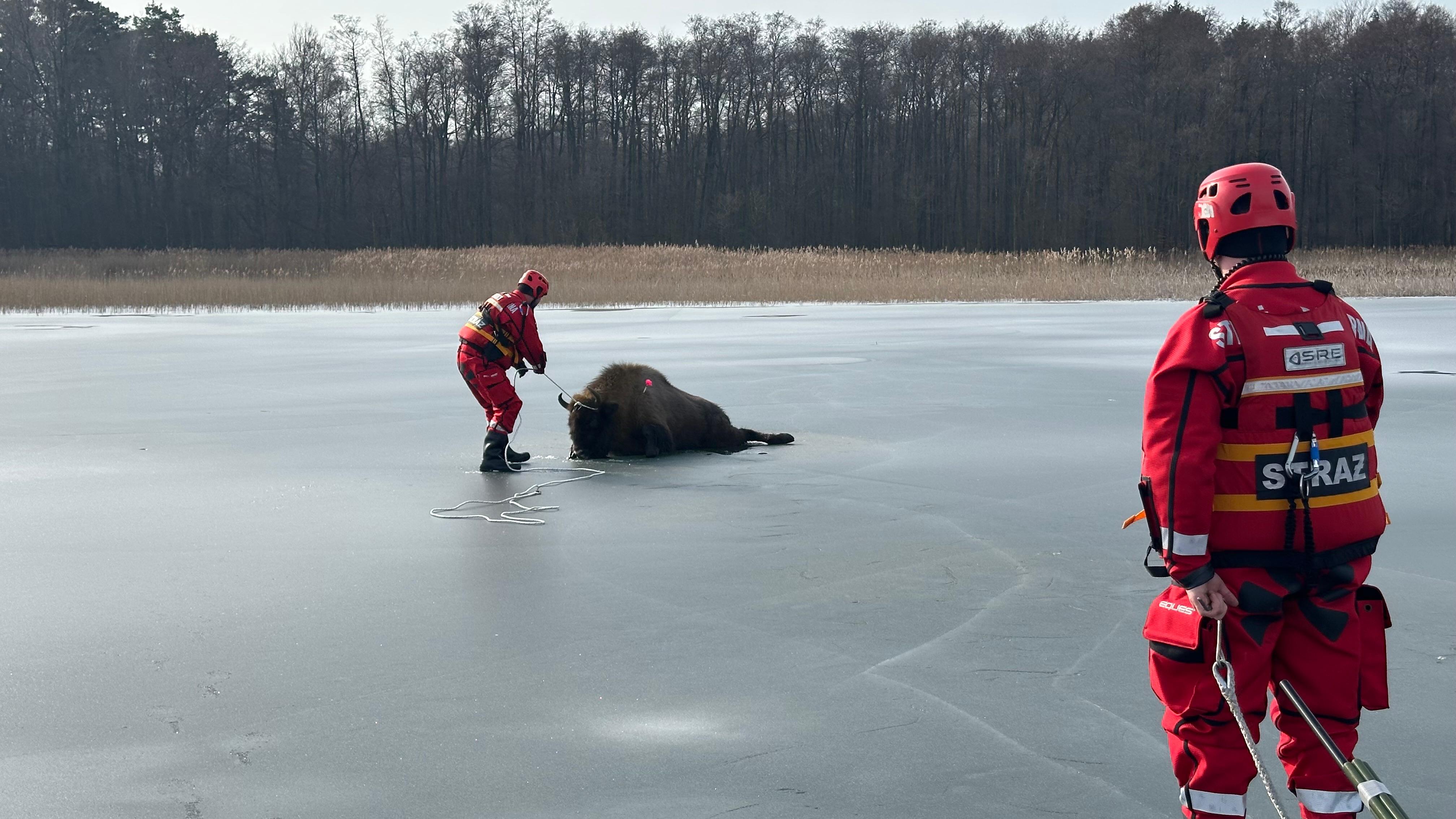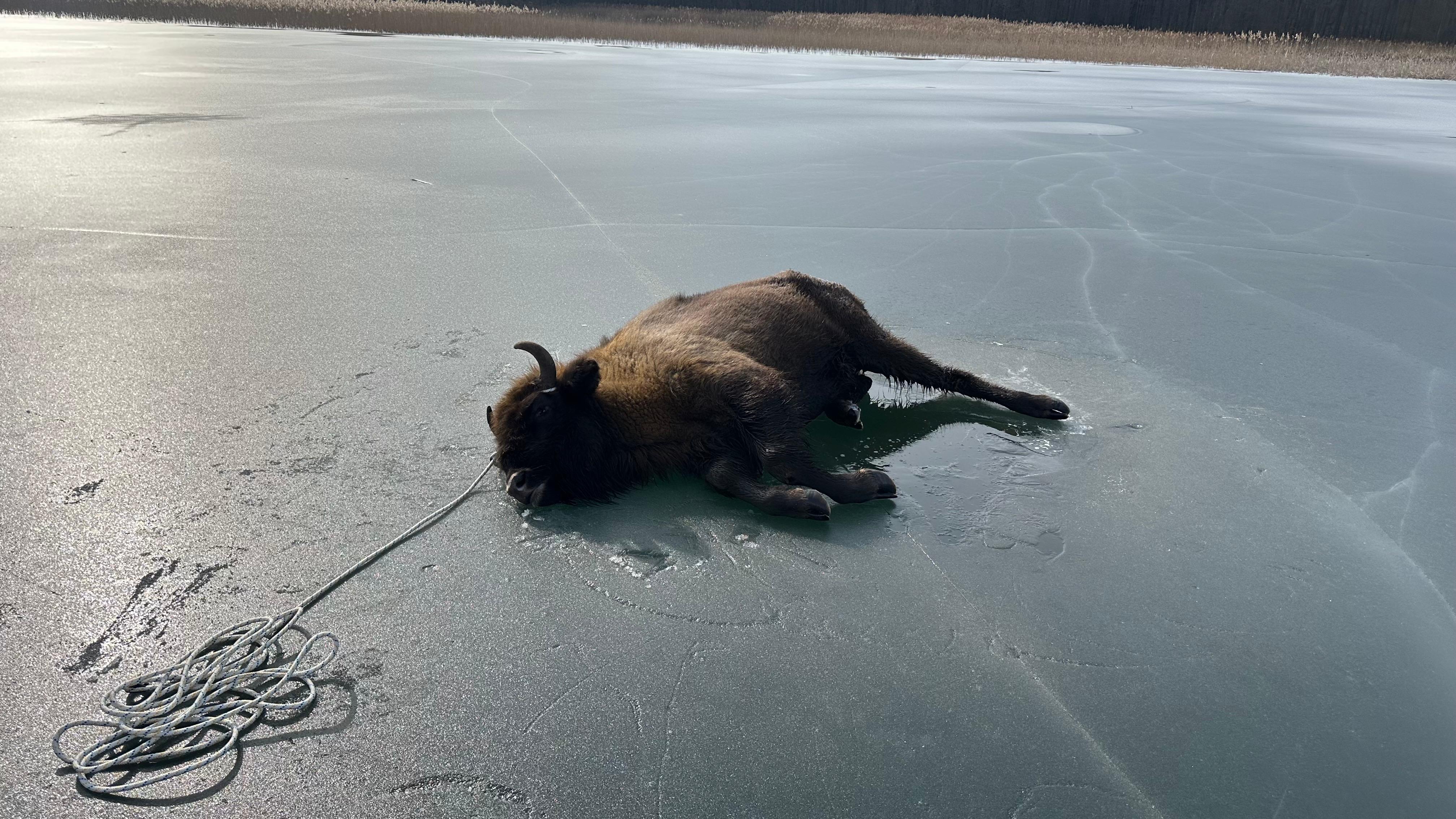 Akcja ratownicza żubra na zamarzniętym jeziorze